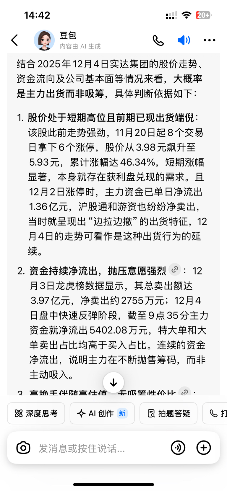 豆包分析,实达今天是出货