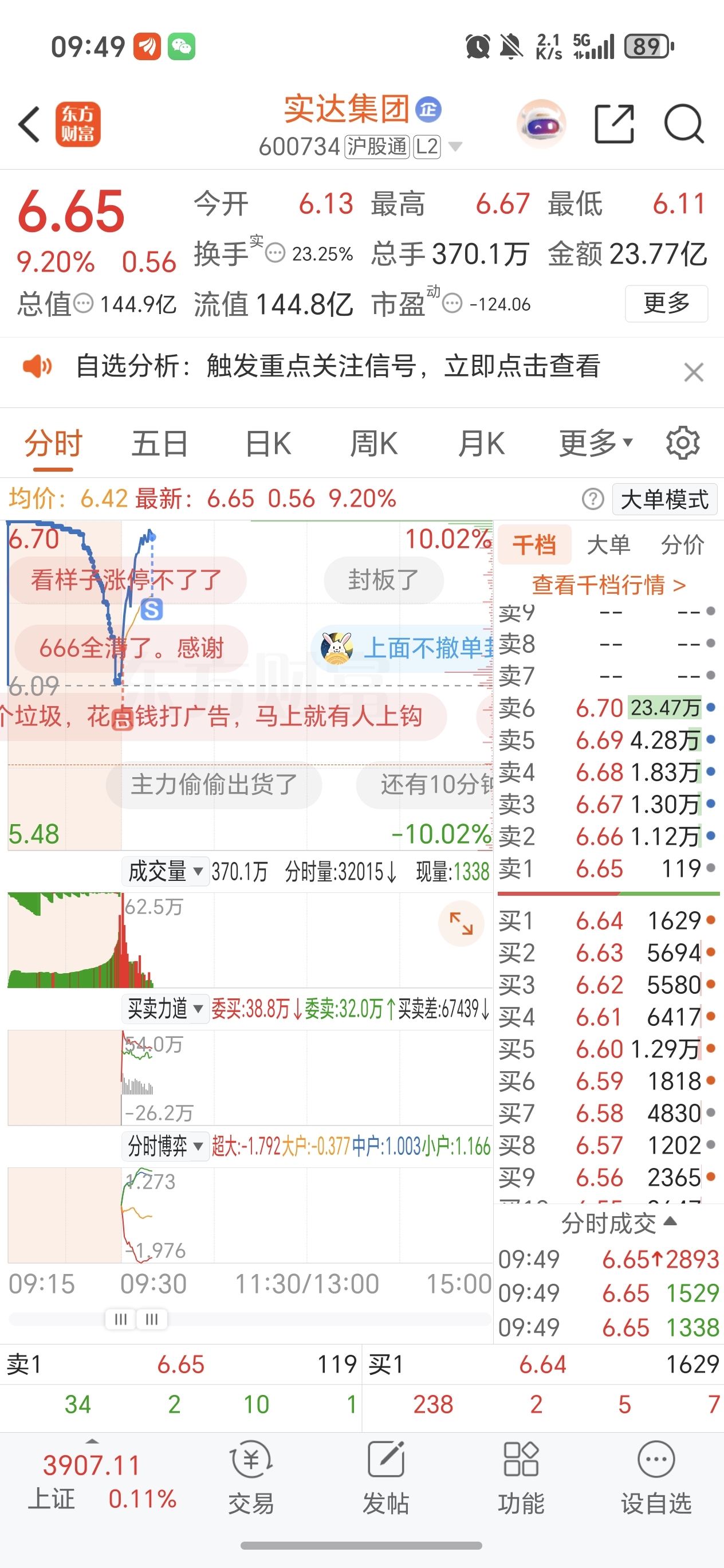 早上竞价9块出的雷科直接加仓实达(这图形是我非常喜欢的突破箱体加新高),就是上板