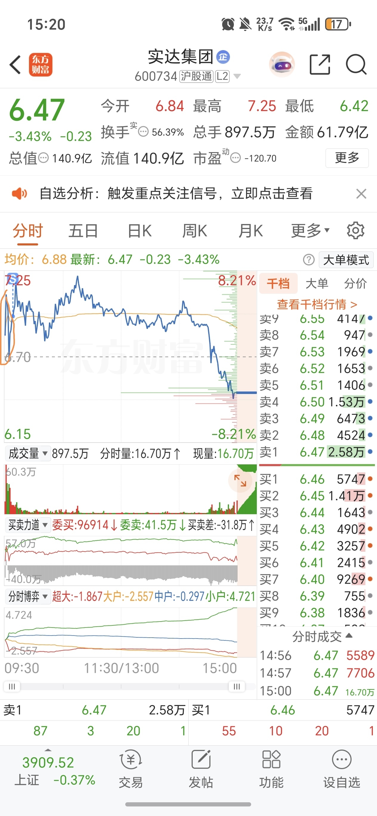 今天早上竞价的量非常够,高开两个点我是认可的所以第一波冲高没走。但图二里面这波砸穿均线后快速翻绿让我确定了今天要走,所以第二波站上均线后我就立马砸出来了。确实没砸错