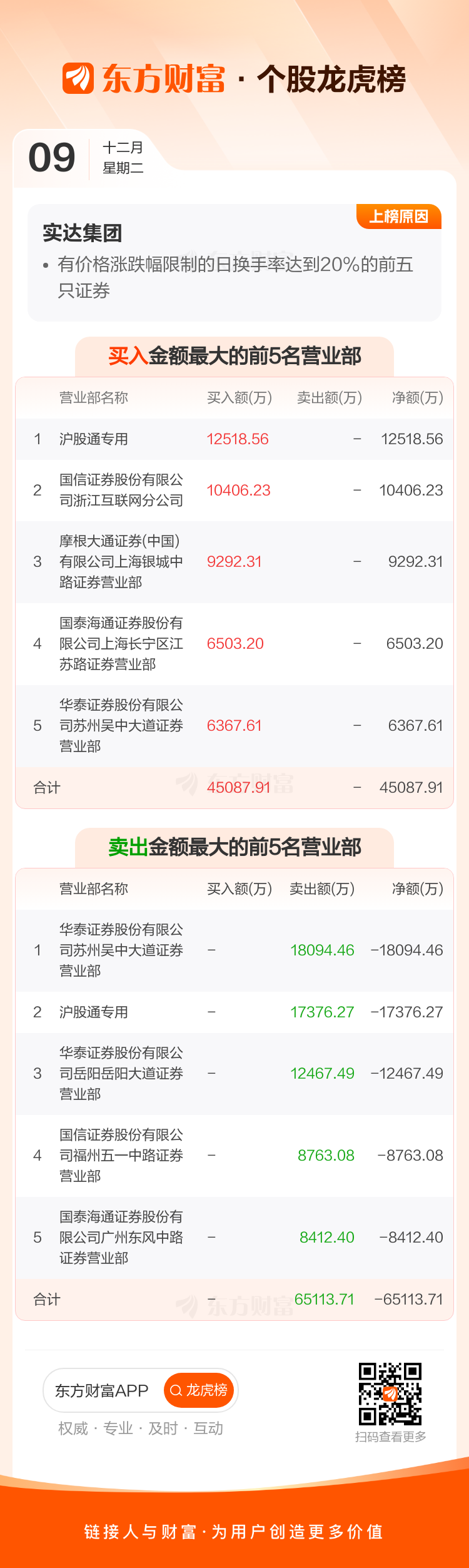 交易所2025年12月9日公布的交易公开信息显示,实达集团因成为有价格涨跌幅限制的日换手率达到20%的前五只证券上榜。实达集团当日收报6.47元,涨跌幅-3.43%,偏离值41.21%,换手率41.21%,成交额61.79亿。
