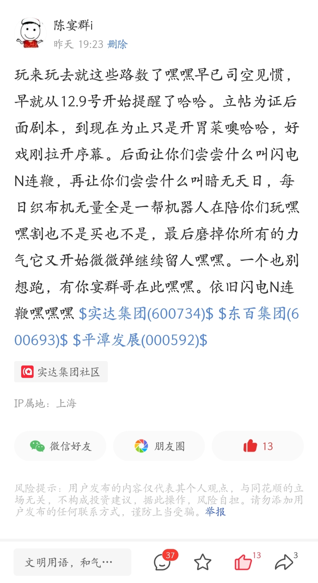 温馨提示: 1.根据《证券法》规定,禁止编造、传播虚假信息或者误导性信息,扰乱证券市场;2.用户在本社区发表的所有资料、言论等仅代表个人观点,与本网站立场无关,不对您构成任何投资建议。用户应基于自己的独立判断,自行决定证券投资并承担相应风险。《东方财富社区管理规定》