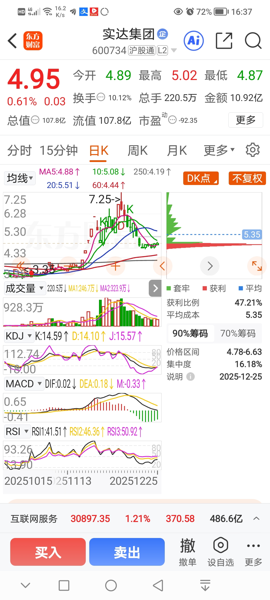 $实达集团(SH600734)$筹码上下切换洗差不多啦,准备来第二波,明天水下就可以干(明天开盘那一刹4.92~4.90区间有仓位的老铁可试一下水赚点节日费用