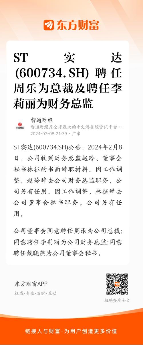 ST实达(600734.SH)公告,2024年2月8日,公司收到财务总监赵玲、董事会秘书林征的书面辞职材料。因工作调整,赵玲辞去公司财务总监职务,公司另有任用。因工作调整,林征辞去公司董事会秘书职务,公司另有任用。