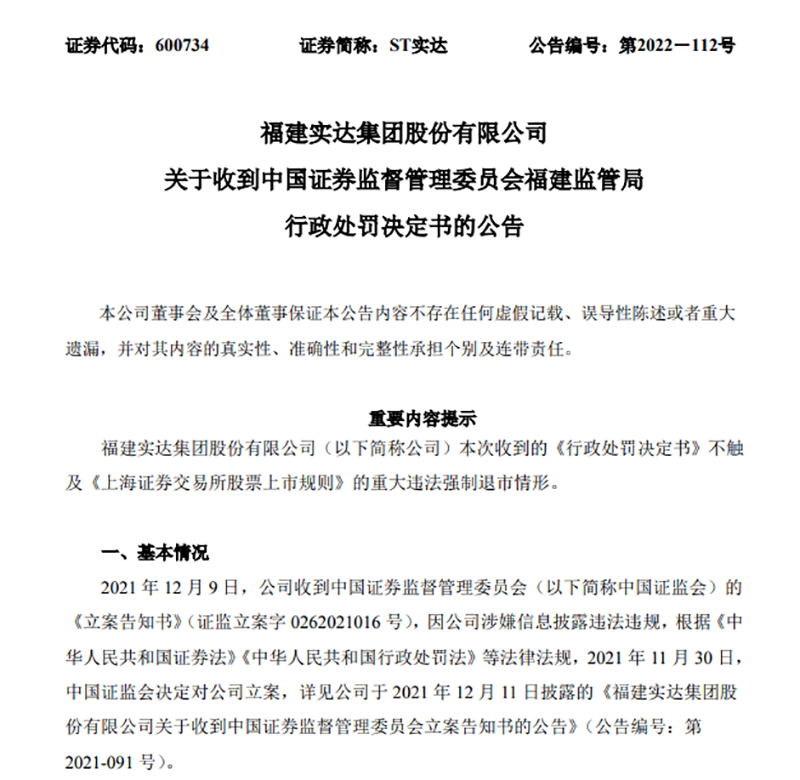 另一边,一年前同样因信披违规被立案的ST实达收到了福建证监局出具的《行政处罚决定书》。