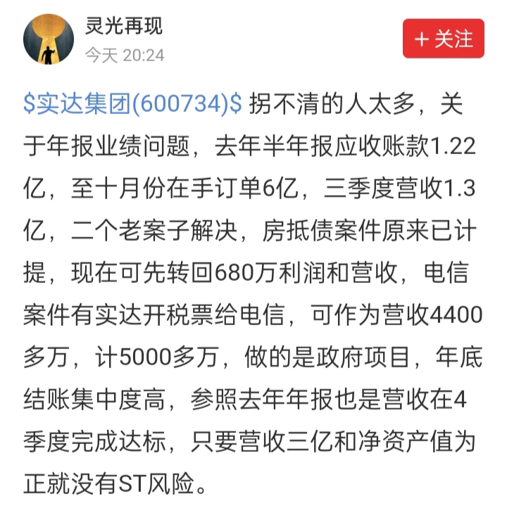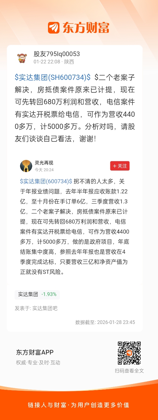 $实达集团(SH600734)$ $二个老案子解决,房抵债案件原来已计提,现在可先转回680万利润和营收,电信案件有实达开税票给电信,可作为营收4400多万,计5000多万。分析对吗,请股友们谈谈自己看法,谢谢!