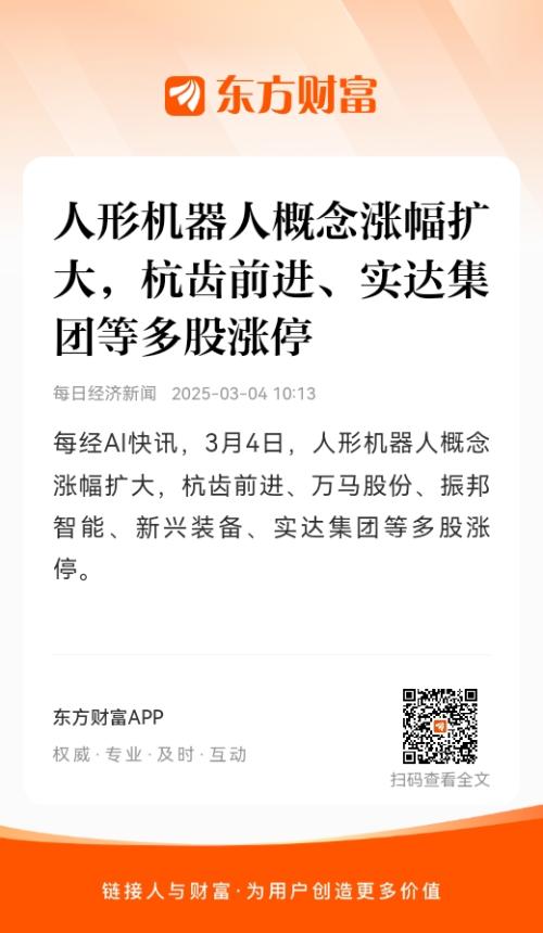 每经AI快讯,3月4日,人形机器人概念涨幅扩大,杭齿前进、万马股份、振邦智能、新兴装备、实达集团等多股涨停。