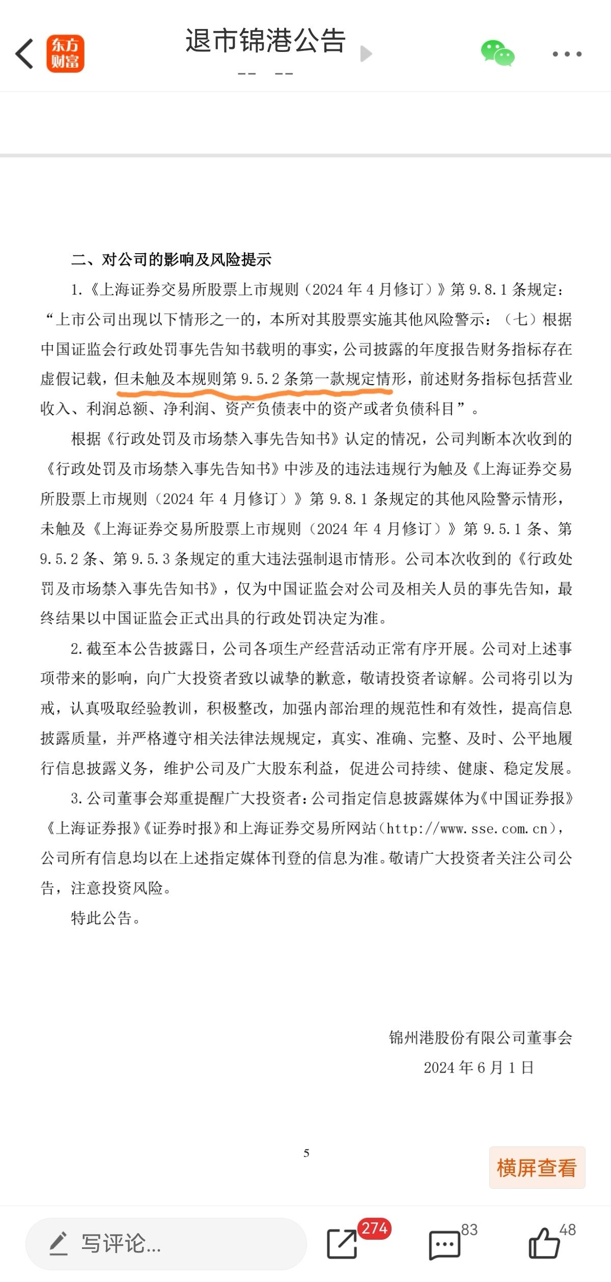 慌啥,你兄弟锦州港一开始也没说触及重大违法。后面不还是强制退市了?