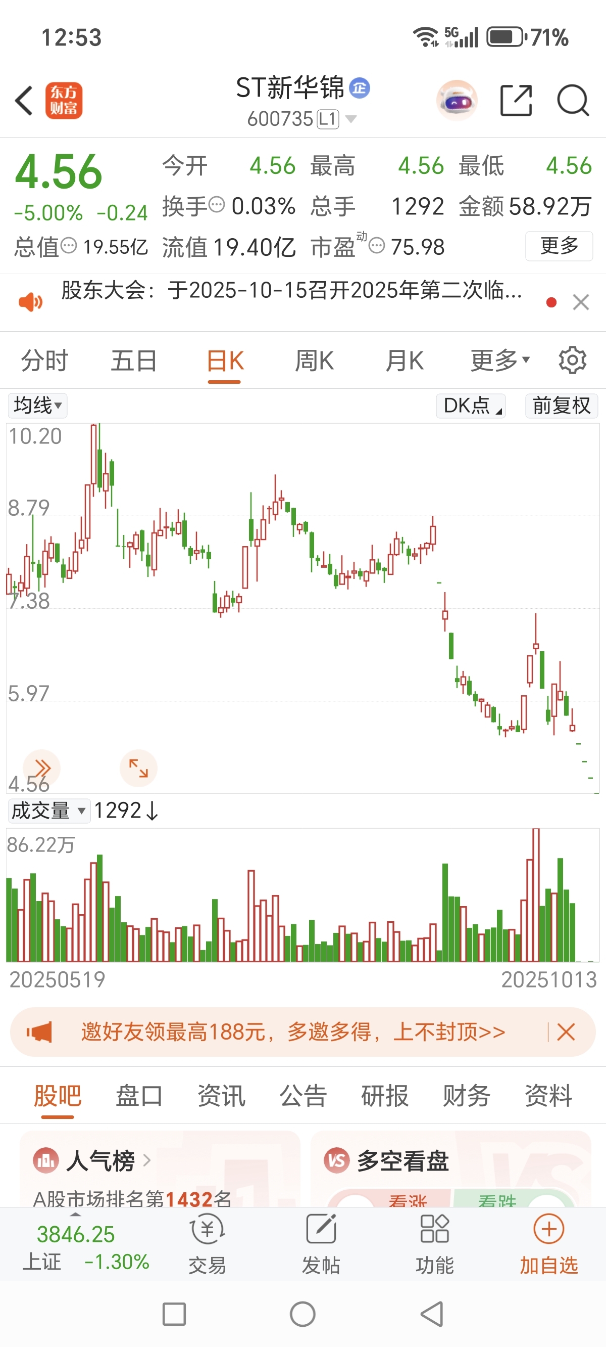 $ST新华锦(SH600735)$ $上证指数(SH000001)$ 已经连续四个跌停了,谁能告诉我还有几个跌停才能打开?