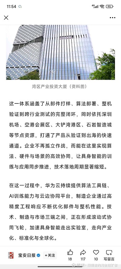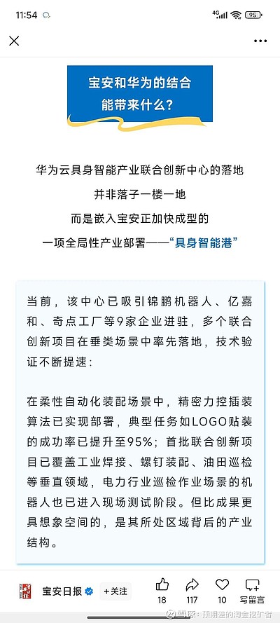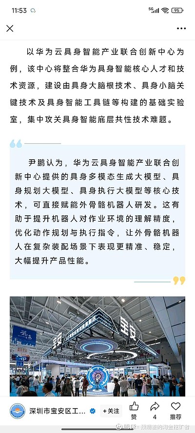 $ST新华锦(SH600735)$ 外骨骼机器人实力入局者,华为云具身智能产业联合创新中心的首批9大入驻企业之一——锦鹏机器人。新华锦占比51%,实现控股,转型坚决。华为云具身智能产业联合创新中心,将整合华为具身智能核心人才和技术资源,建设由具身大脑根技术、具身小脑关键技术及具身智能工具链等构建的基础实验室,集中攻关具身智能底层共性技术难题。