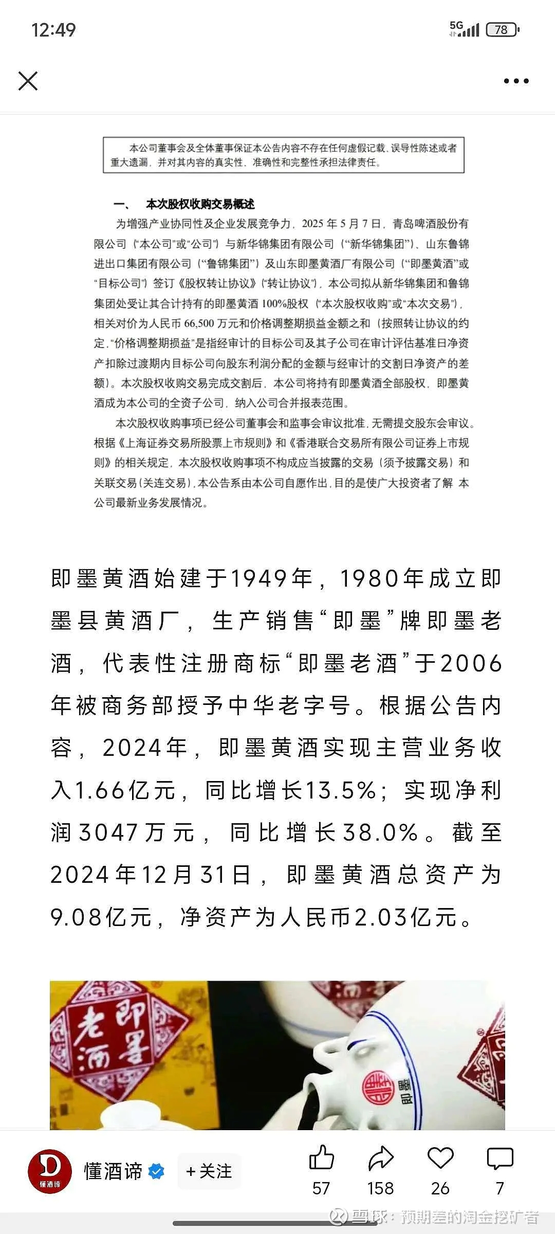 即墨黄酒始建于1949年,1980年成立即墨县黄酒厂,生产销售“即墨”牌即墨老酒,代表性注册商标“即墨老酒”于2006年被商务部授予中华老字号。根据公告内容,2024年,即墨黄酒实现主营业务收入1.66亿元,同比增长13.5%;实现净利润3047万元,同比增长38.0%。截至2024年12月31日,即墨黄酒总资产为9.08亿元,净资产为人民币2.03亿元。