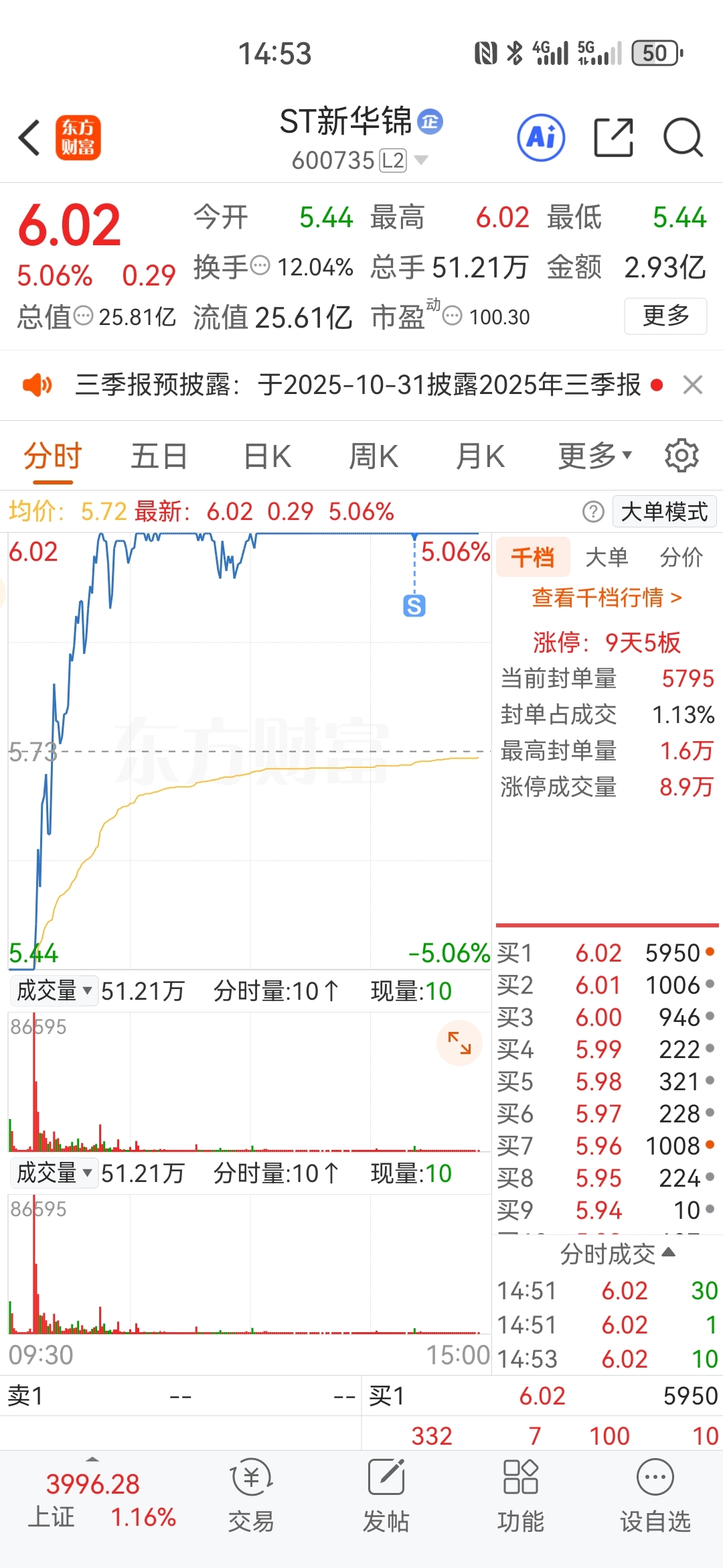 $ST新华锦(SH600735)$ 早盘清了沐邦留着新华锦开板低吸用的,结果出去看了下正股的行情就错过了新华锦,13万手封单直接被干完了,吐血,没缘分,10个点的大肉都没吃到,板上清仓了,祝留下的家人们继续发财,后续就只守着万方和正平了
