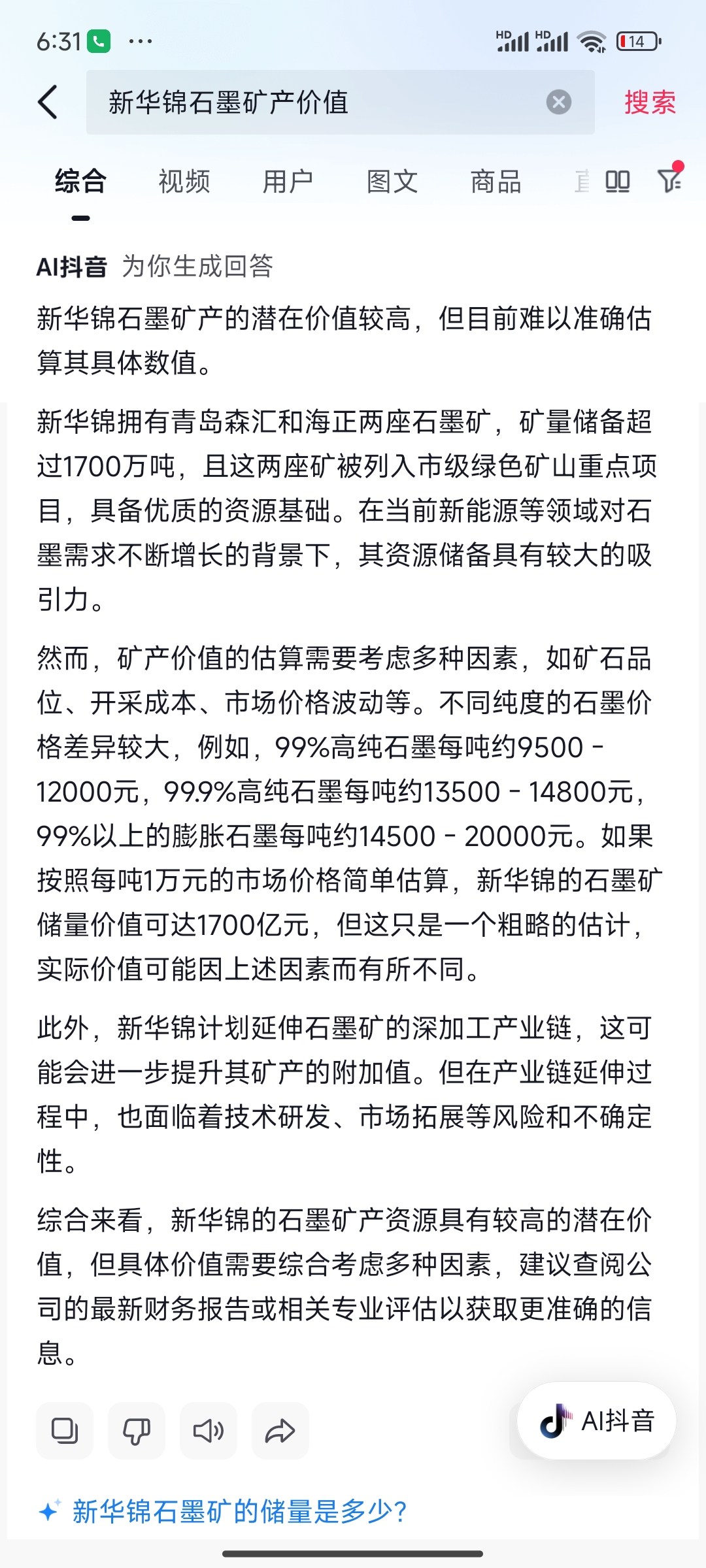 $ST新华锦(SH600735)$ 抖音搜索,石墨矿价值一千七百亿,哈哈,我觉得17亿就很高了,毕竟市值才二十多亿。