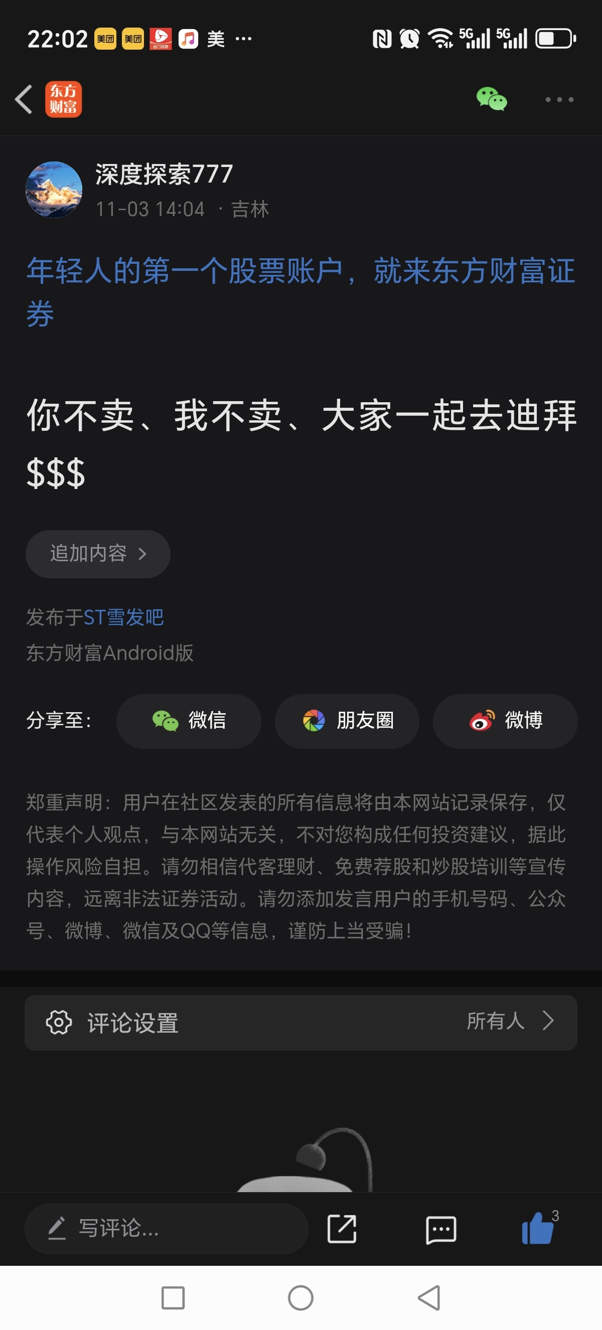 温馨提示: 1.根据《证券法》规定,禁止编造、传播虚假信息或者误导性信息,扰乱证券市场;2.用户在本社区发表的所有资料、言论等仅代表个人观点,与本网站立场无关,不对您构成任何投资建议。用户应基于自己的独立判断,自行决定证券投资并承担相应风险。《东方财富社区管理规定》