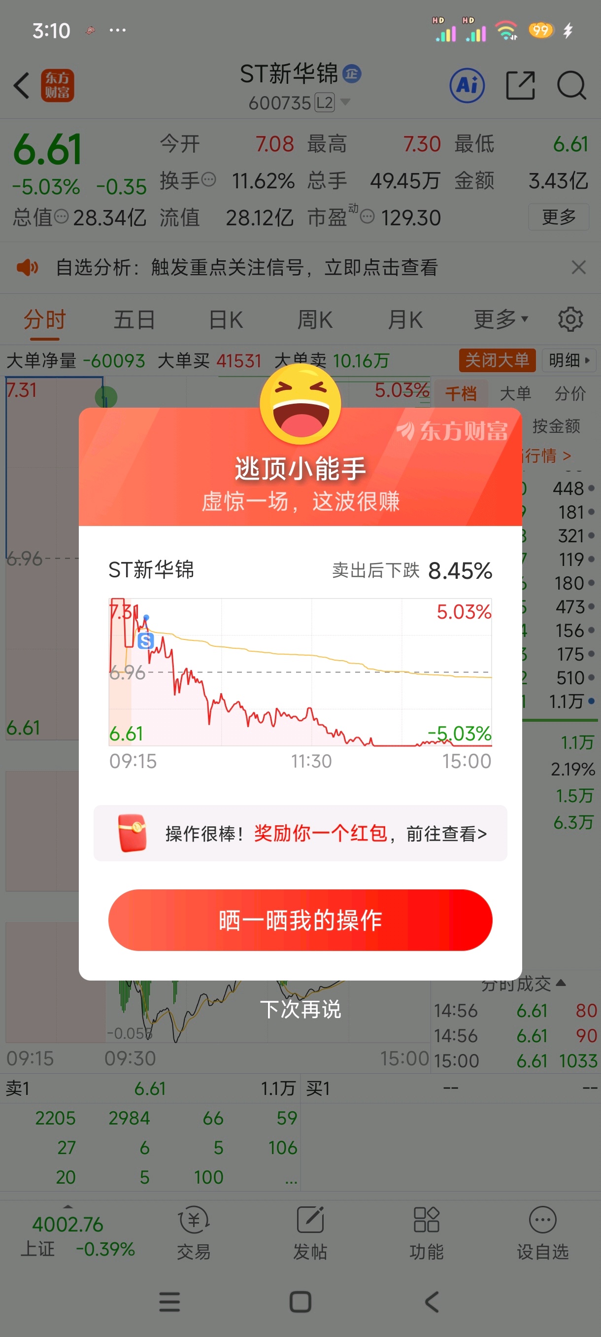 $ST新华锦(SH600735)$ 果断清仓永久删除自选,明天去买$*ST正平(SH603843)$ 和$*ST东晶(SZ002199)$ ,祝各位老板们发财
