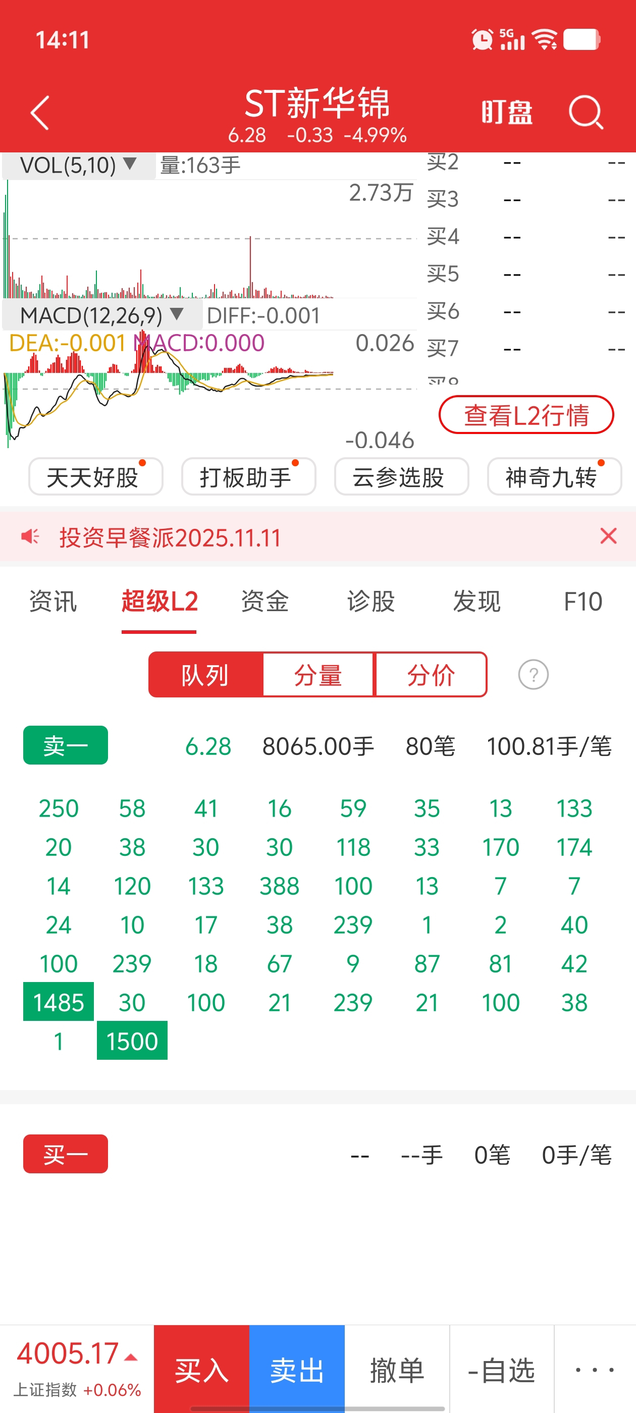 $ST新华锦(SH600735)$ $*ST亚太(SZ000691)$ $*ST交投(SZ002200)$ 只有八千手在卖,已经洗到位了,看谁还在低位割肉,明天高开涨停又追的就是真正的韭菜了,现在ST行情还早,这个位置在卖的建议离开这个市场,你只会越做越小,做ST谁没有套过一二十个点