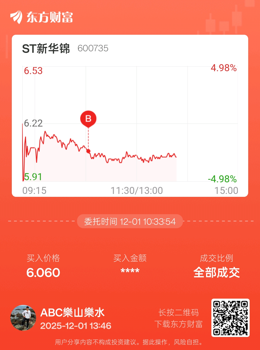 温馨提示: 1.根据《证券法》规定,禁止编造、传播虚假信息或者误导性信息,扰乱证券市场;2.用户在本社区发表的所有资料、言论等仅代表个人观点,与本网站立场无关,不对您构成任何投资建议。用户应基于自己的独立判断,自行决定证券投资并承担相应风险。《东方财富社区管理规定》
