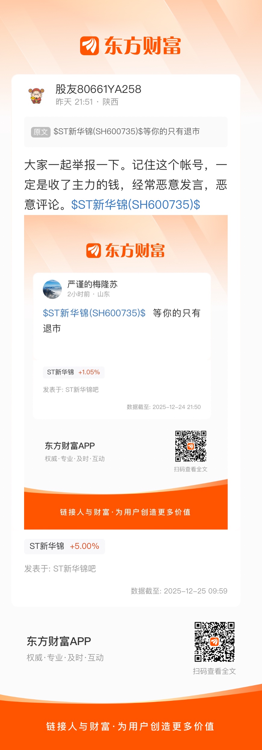 大家一起举报一下。记住这个帐号,一定是收了主力的钱,经常恶意发言,恶意评论。$ST新华锦(SH600735)$