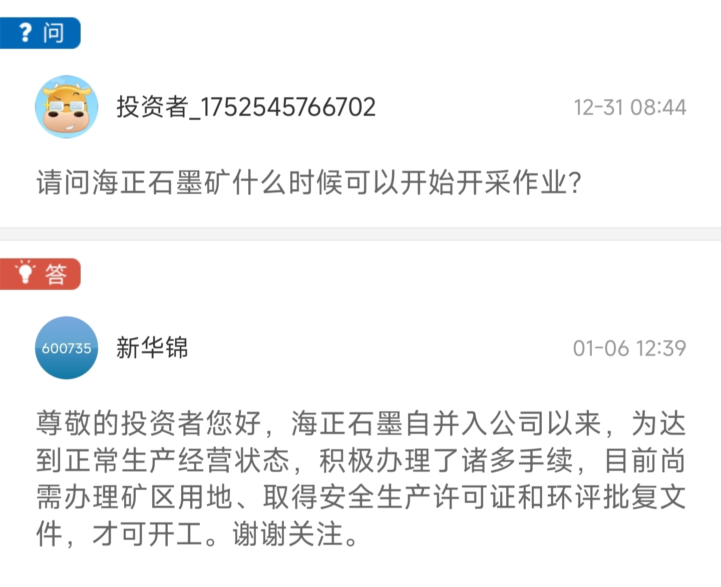 而是海正石墨矿归属问题,1月6日董秘回答海正石墨矿已并入了ST新华锦,就不存在回购问题。海正石墨矿今值9亿元,扣除1.6亿购买款,ST新华锦净赚7.4亿元左右,远超大股东占用资金。假设ST新华锦退市,凭借两座石墨矿,在三板里也应该定位在20元左右,二年后可向北交所申请上市,上市时正值第三代半导体普及之时,ST新华锦可能成为北交所第一只上500元的股票。