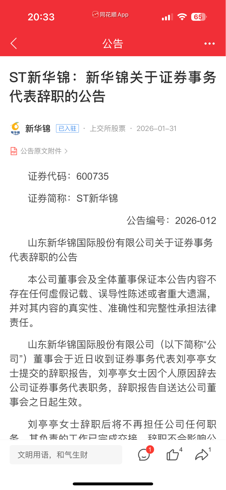 $ST新华锦(SH600735)$ ST新华锦证代辞职并非偶然,恰逢股东重整进入实质阶段、青岛国资接盘实控人变更箭在弦上,此次人事调整正是公司为迎接新实控人、推进治理优化的前置动作,后续将聘任专业度高、有资本运作经验的新任者,旧岗交接完成后将适配新管控体系布局信披与投关工作,为后续重整落地、资本运作、清欠推进扫清人事衔接障碍,属于重整进程中的积极信号!