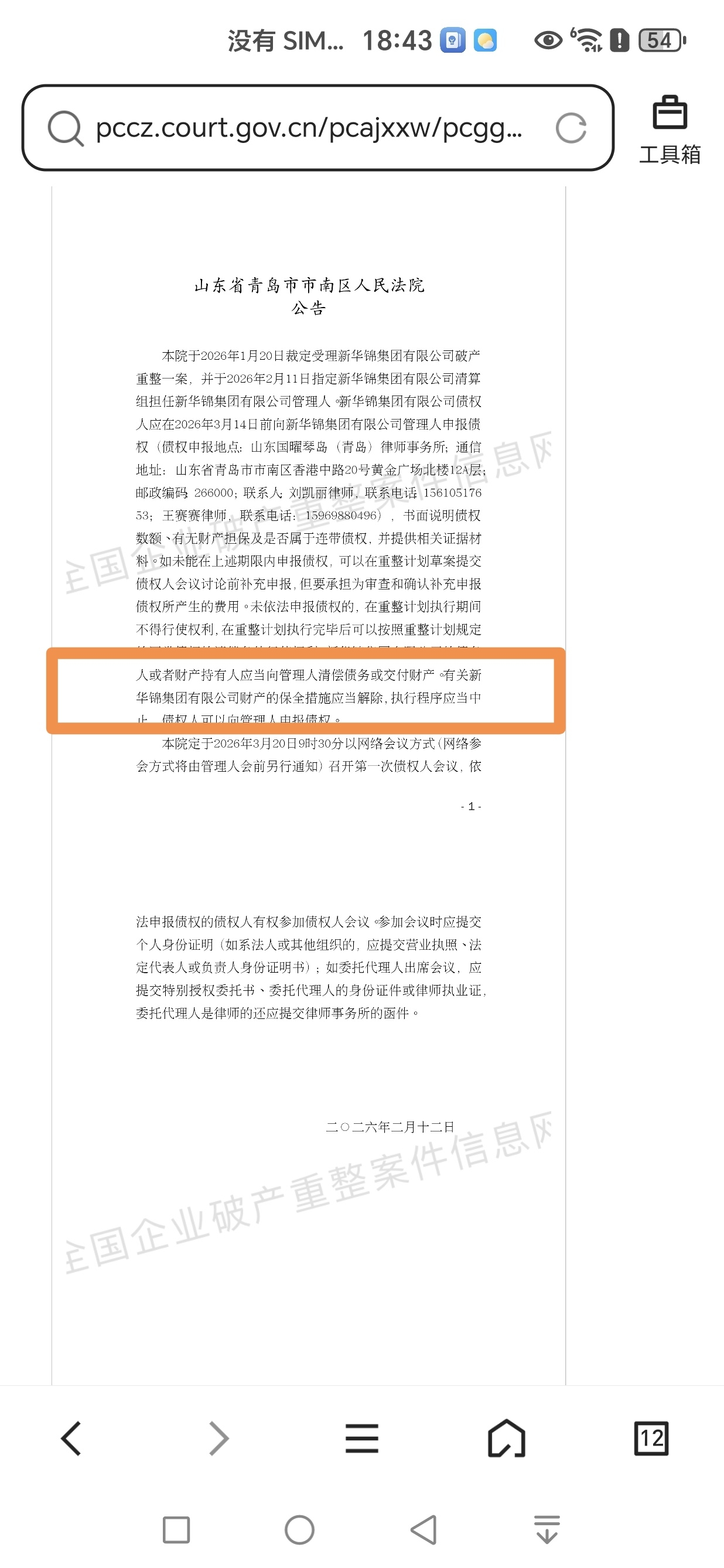 $ST新华锦(SH600735)$ 看下图标识,这句话分量很重,在重整执行过程中可以向管理人申请解除财产保全和冻结。解除后可以继续交易即墨老酒股权,也可以跟银行协商处置股份,解除冻结下利于引入投资人提前还款,投资人还款后也可以保留债权在重整过程中向新华锦申报债权。