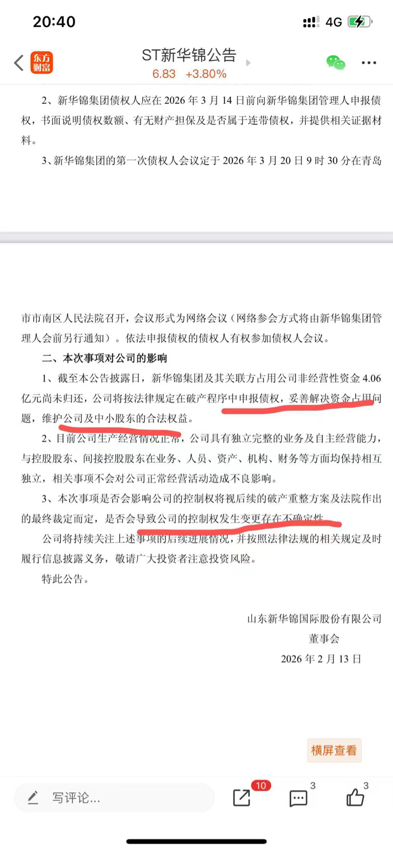 $ST新华锦(SH600735)$ 公司经营正常,没有提及退市风险,控股权变更预期