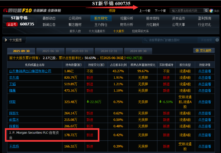 ST新华十大股东里面有世界顶级的金融大鳄J.P.MorganSecurities