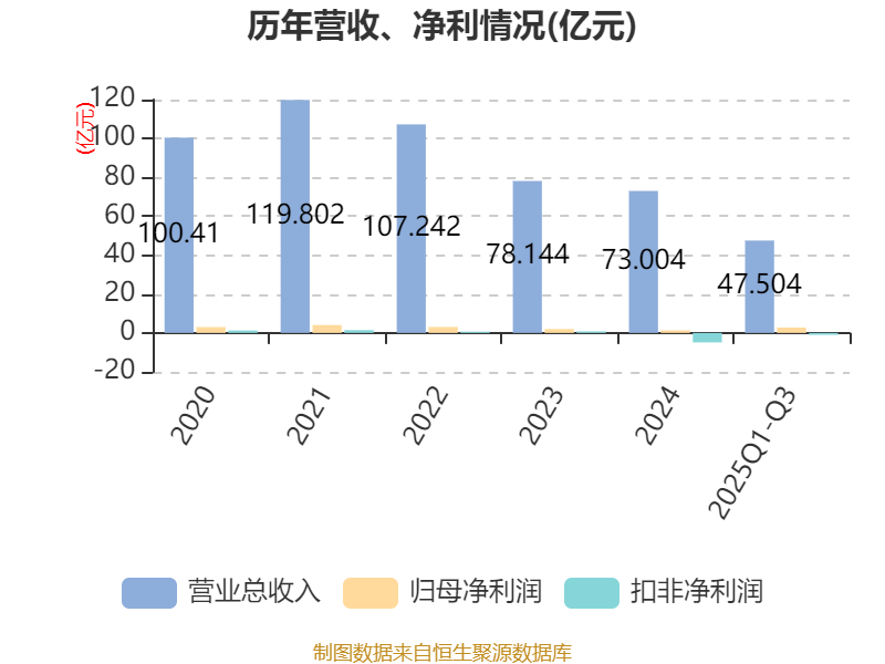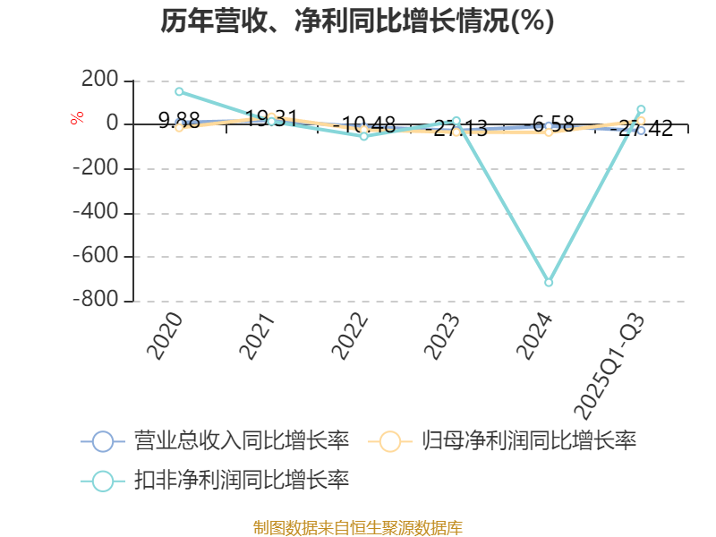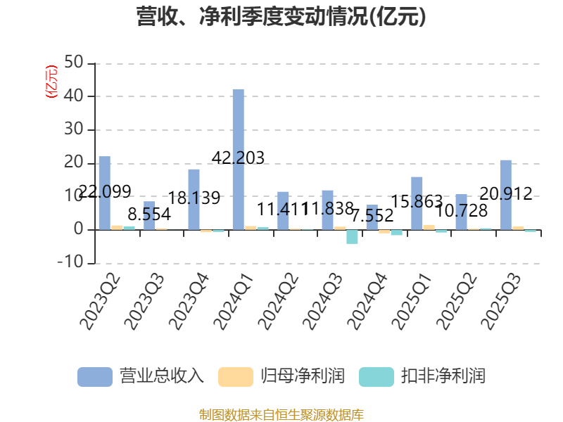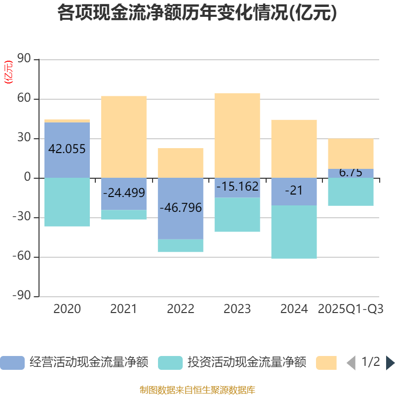 2025年前三季度,公司经营活动现金流净额为6.75亿元,同比增加23.34亿元;筹资活动现金流净额23.02亿元,同比减少17.82亿元;投资活动现金流净额-21.31亿元,上年同期为-36.77亿元。