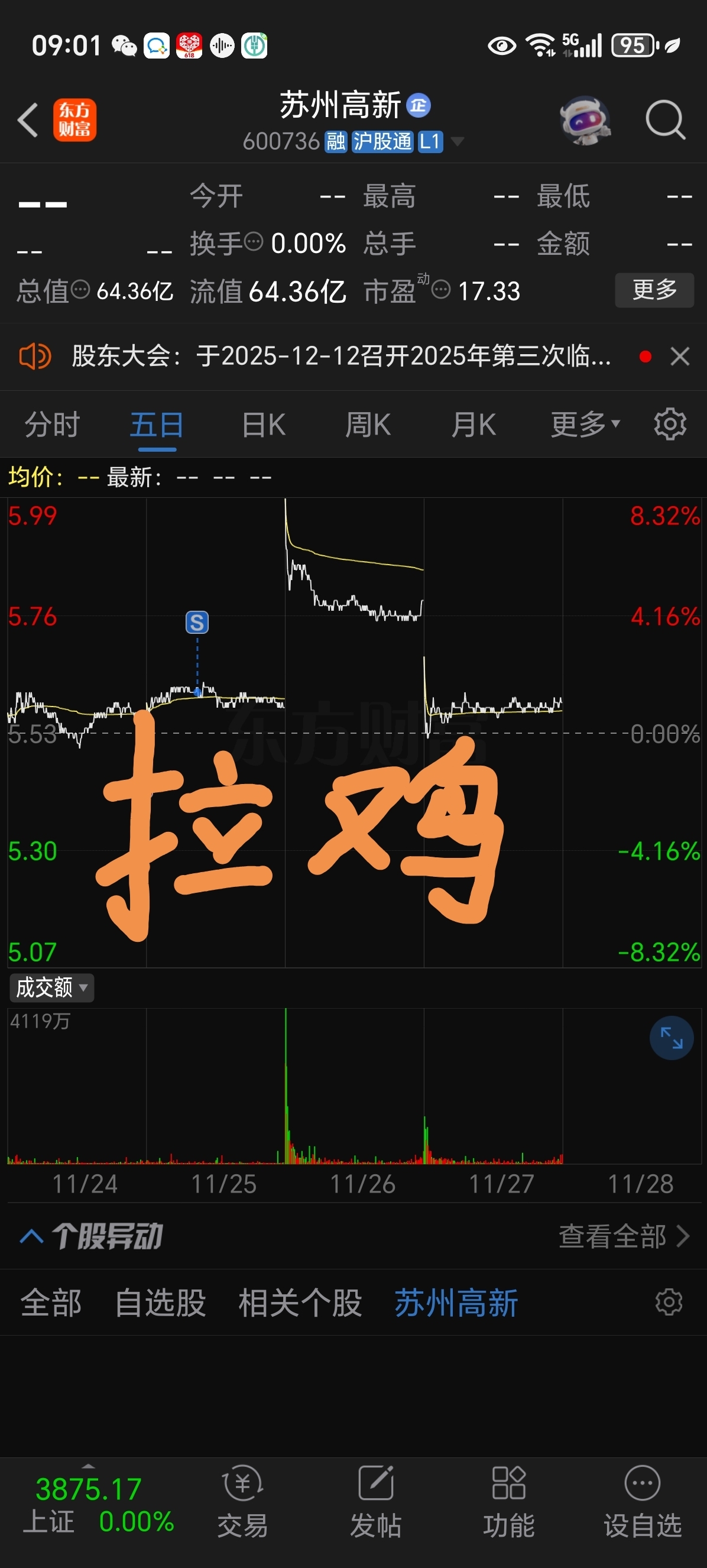 $苏州高新(SH600736)$ 刚一卖,第二天就暴力拉升,第三天又回到原点