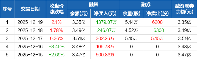 融资方面,当日融资买入2451.05万元,融资偿还3830.12万元,融资净偿还1379.07万元。融券方面,融券卖出6200股,融券偿还0股,融券余量5.14万股,融券余额29.97万元。融资融券余额合计3.35亿元。