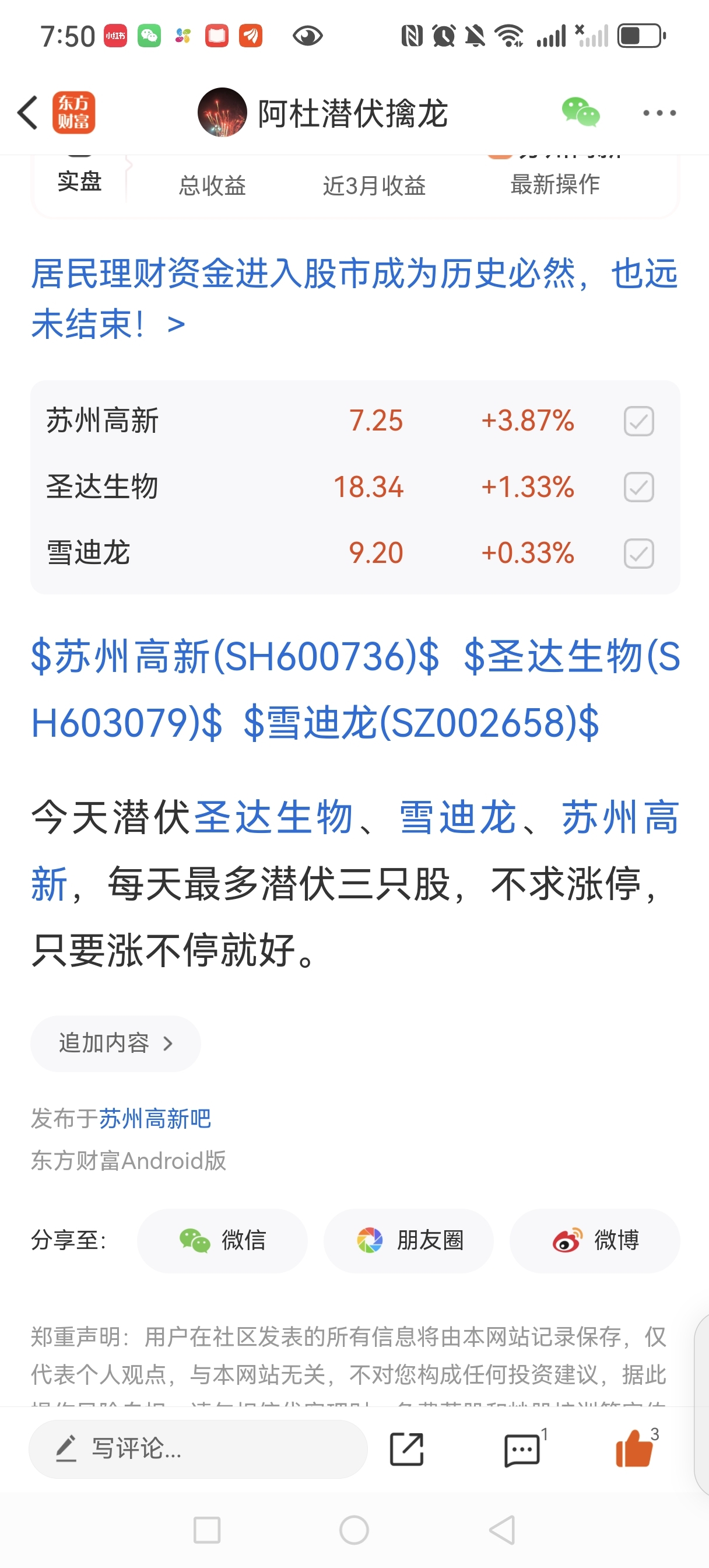 $苏州高新(SH600736)$ $圣达生物(SH603079)$ $雪迪龙(SZ002658)$ 昨天潜伏进的三只股,今天全部收红。不求涨停,只求天天涨不停