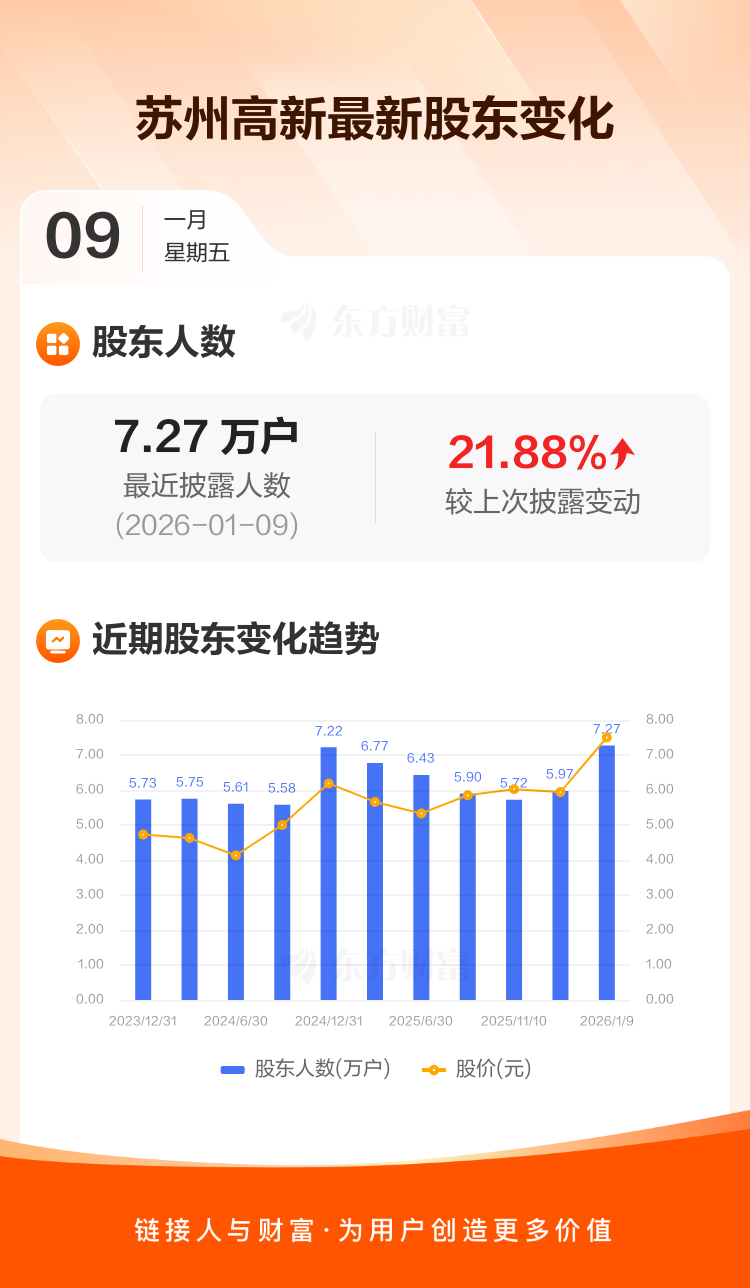 苏州高新:截至1月9日最新股东户数7.27万户,较上期增加21.88%