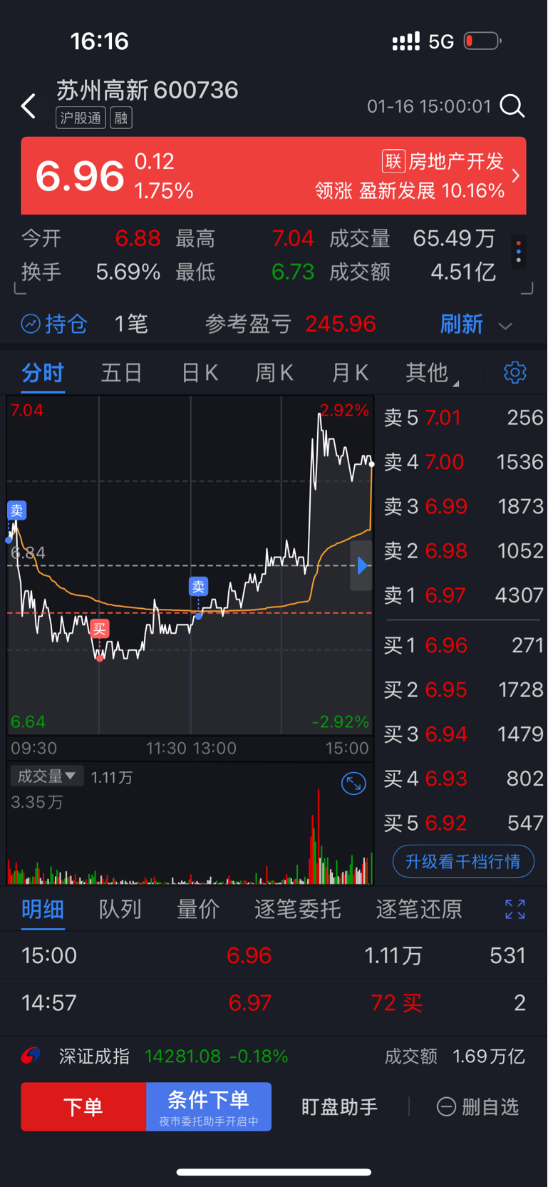 $苏州高新(SH600736)$ 我本来是想着今天跌,降低成本,没想到