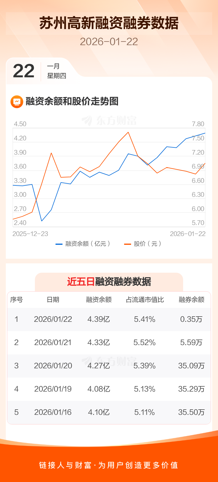 交易所最新数据显示,苏州高新于2026年1月22日获融资买入3926.53万元,融资偿还3393.00万元,当日融资净买入533.53万元。目前,该股融资余额4.39亿,占流通市值比例为5.41%。