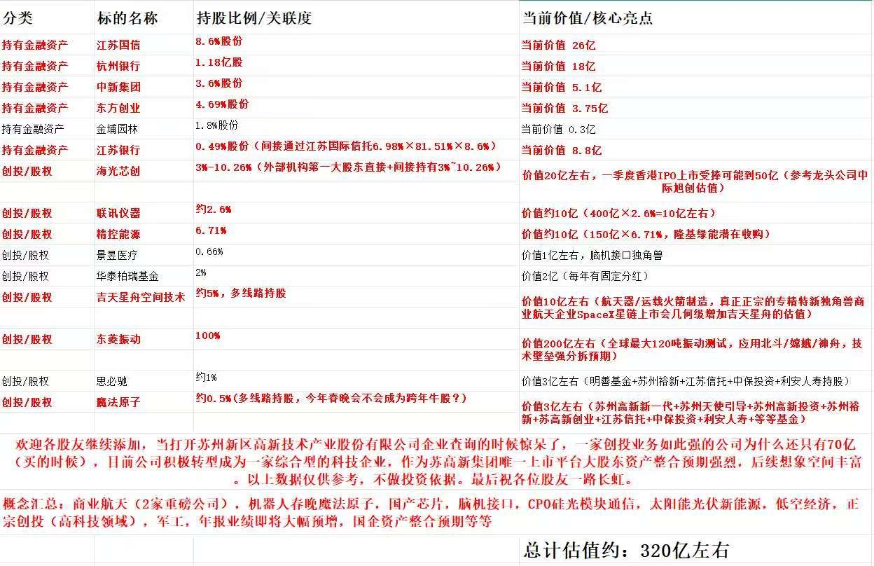 $苏州高新(SH600736)$$汉威科技(SZ300007)$苏州高新这张表我看呆了!金融资产+硬核创投,随便拎一个出来都能打。东菱振动、吉天星舟、海光芯创、魔法原子…个个都是王炸!春晚舞台+机器人概念,魔法原子这波直接把科技和流量拉爆了。加上腾讯元宝派10亿现金红包,提前把春节行情流量拉满,接下来的时间一天天临近过年,气氛已经到位。加油,祝大家都赚钱,开开心心过好年。