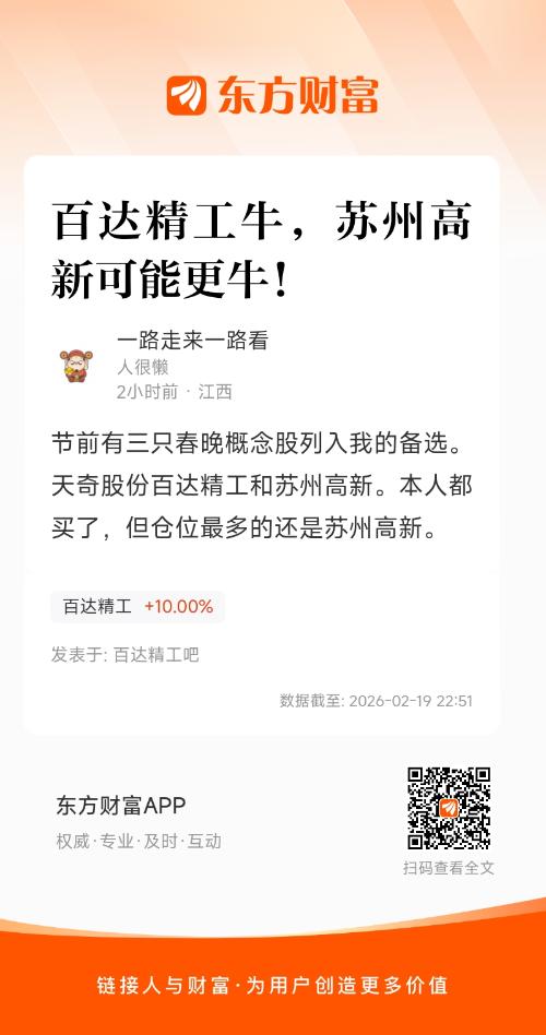 节前有三只春晚概念股列入我的备选。天奇股份百达精工和苏州高新。本人都买了,但仓位最多的还是苏州高新。