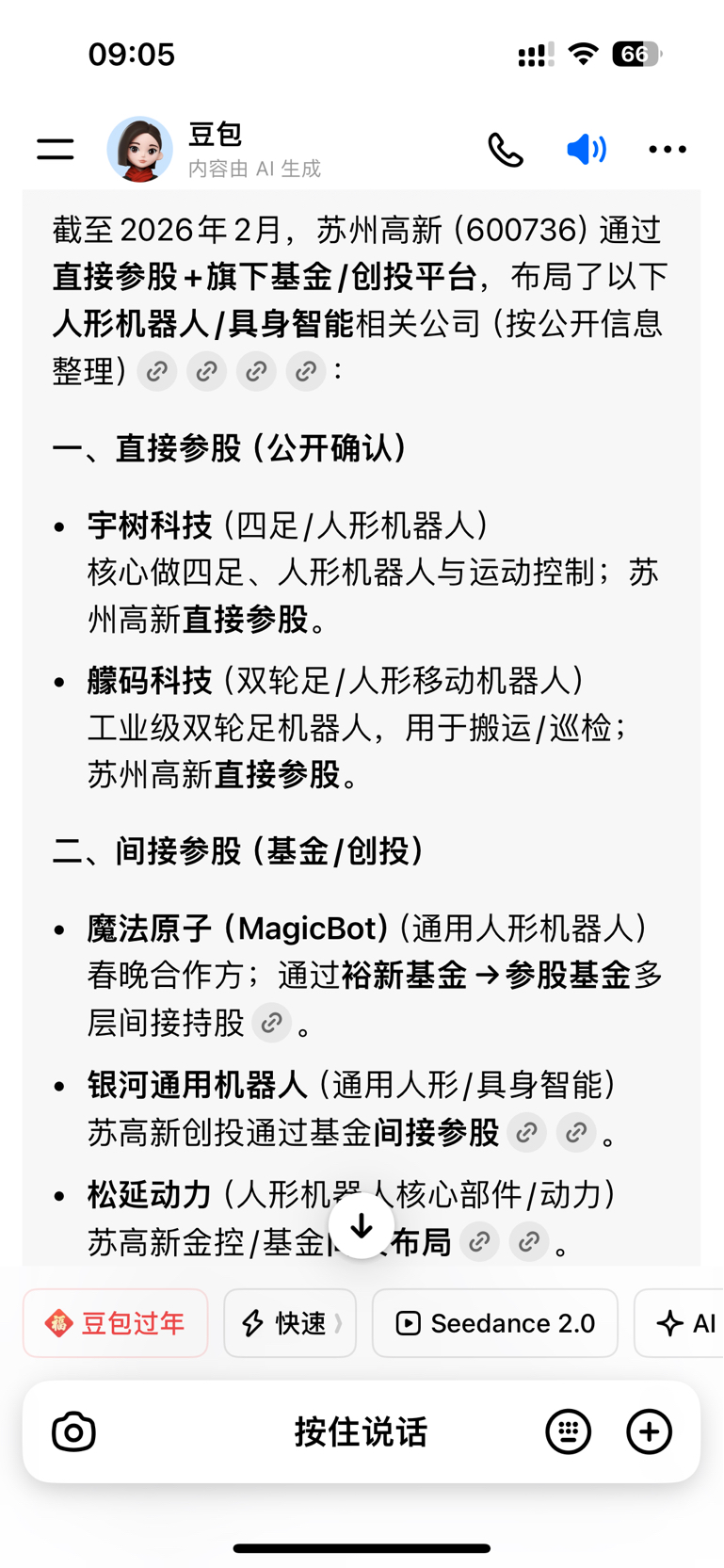 $苏州高新(SH600736)$ 大家不要被网络财经博主骗取接一些高位的盘。他们都是割韭菜产业链的镰刀。现在人工智能很方便。大家一定要分辨。要有正确的认知和理解。不要相信网络上没有依据的小作文。官方的消息才有持续性。苏州高新是唯一一家参股了春晚四家人形机器人公司的A股上市公司。不要看什么嘉美包装、天奇股份。那些都是产业链拉升股价作局的。国晟科技就是一个活生生的教训。