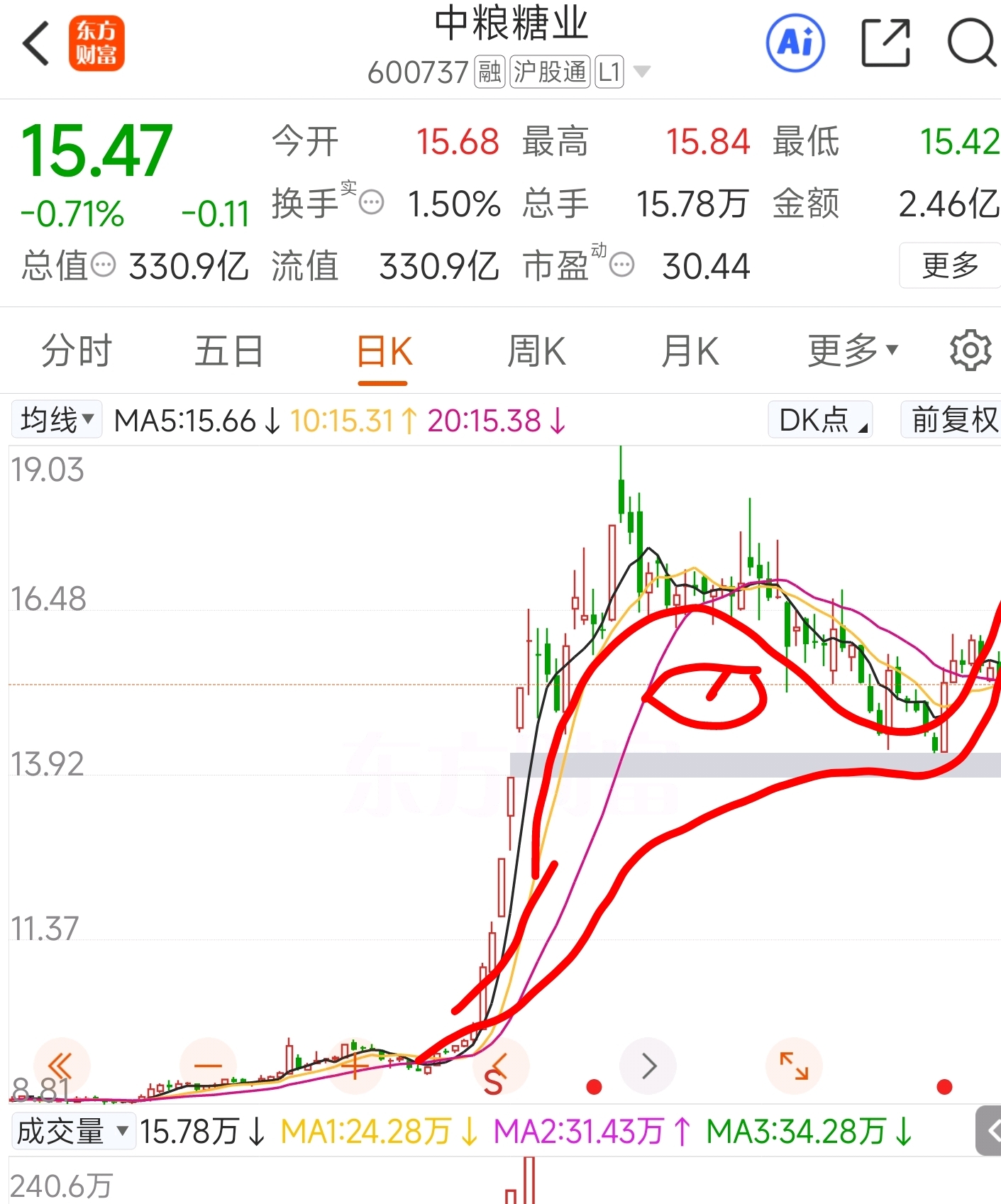 “哪有小孩天天哭”在大盘高歌猛进的这两天里,有这么一只股在默默积攒力量,他坚韧不拔,自强不息,高位盘整连续缩量绿收三天,是主力绘制的精美k线,是农业板块的中流砥柱……明天怎么走不敢预测,有感而发坚定鸭头成行!