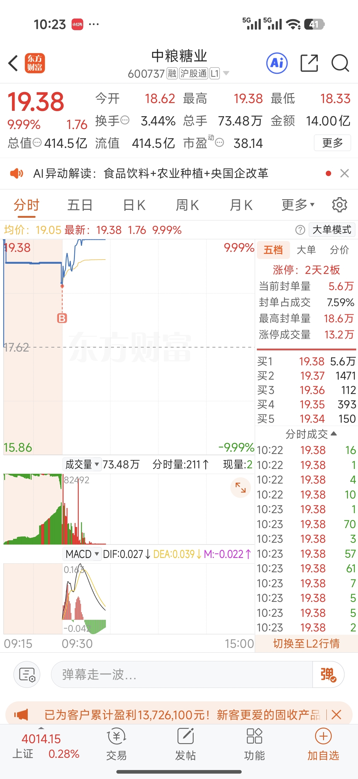$中粮糖业(SH600737)$ 贷款打板,利息赚回来了