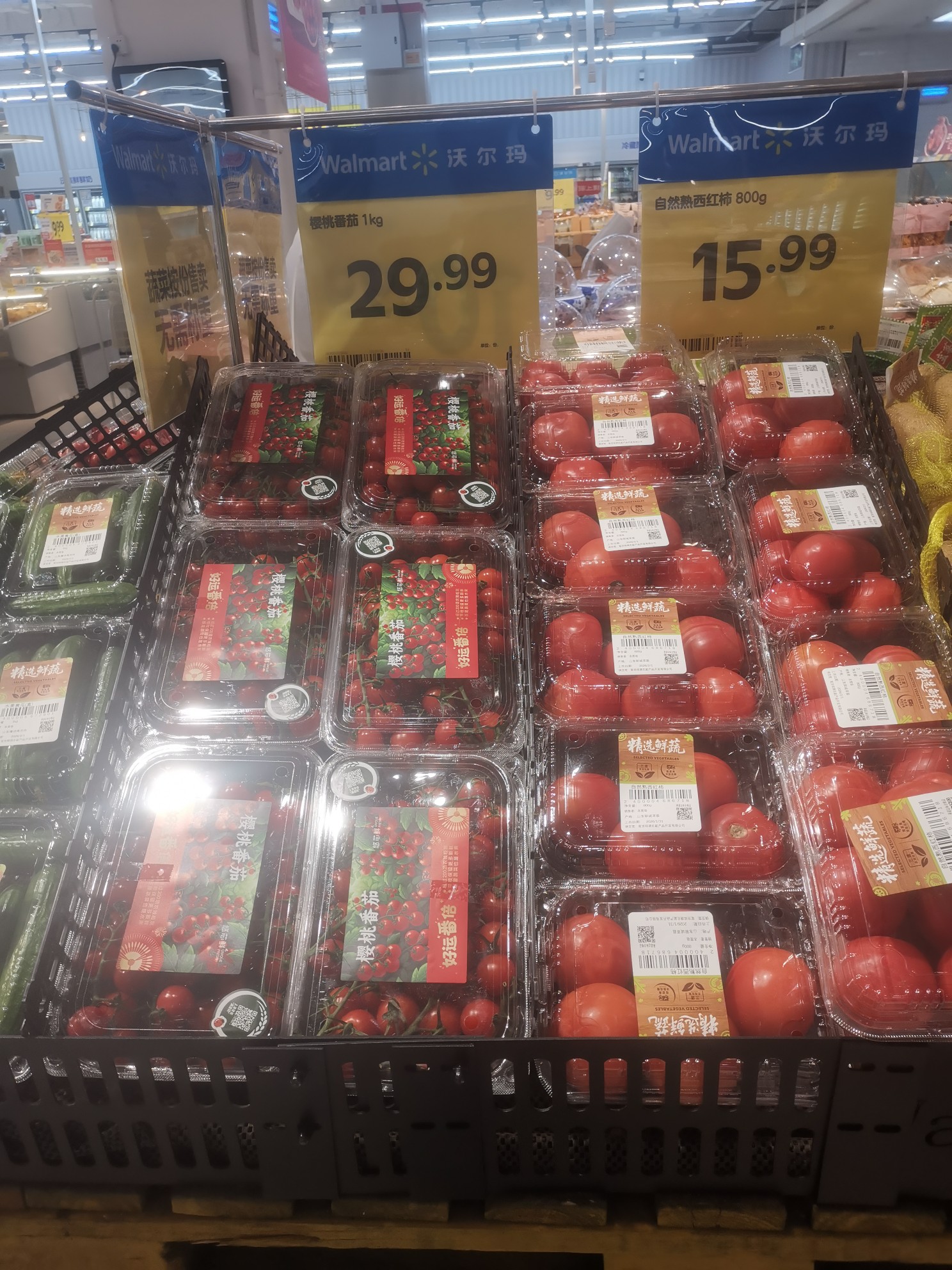 这是今天沃尔玛上海浦东南浦大桥店里的蕃茄,产地是山东的,单价还在高位。