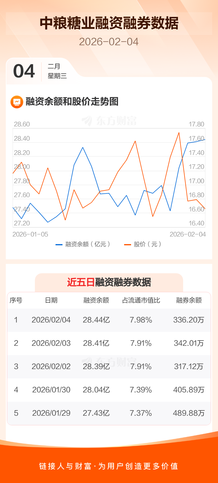 交易所最新数据显示,中粮糖业于2026年2月4日获融资买入4485.49万元,融资偿还4119.08万元,当日融资净买入366.41万元。目前,该股融资余额28.44亿,占流通市值比例为7.98%。