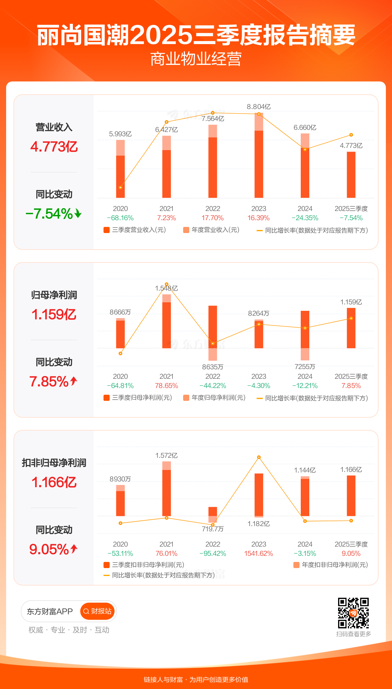丽尚国潮10月31日发布2025年三季报显示,公司前三季实现营业收入4.77亿元,同比下滑7.54%;归母净利润1.16亿元,同比增长7.85%;扣非归母净利润1.17亿元,同比增长9.05%。