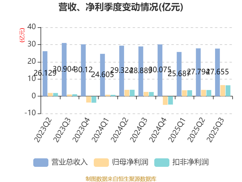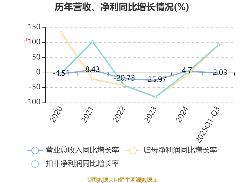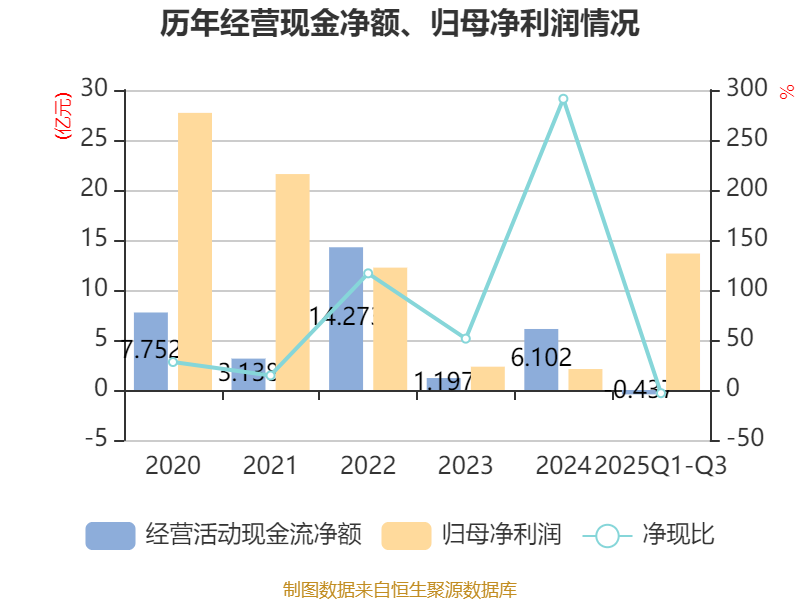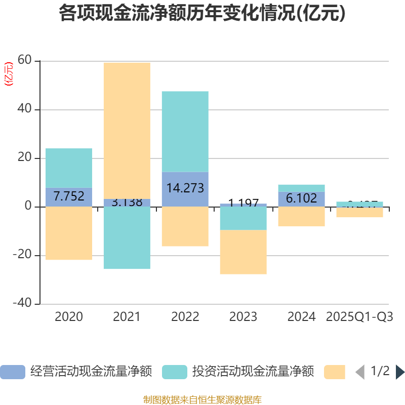 2025年前三季度,公司经营活动现金流净额为-4372.54万元,同比减少2.76亿元;筹资活动现金流净额-3.96亿元,同比减少6.74亿元;投资活动现金流净额2.01亿元,上年同期为1.25亿元。