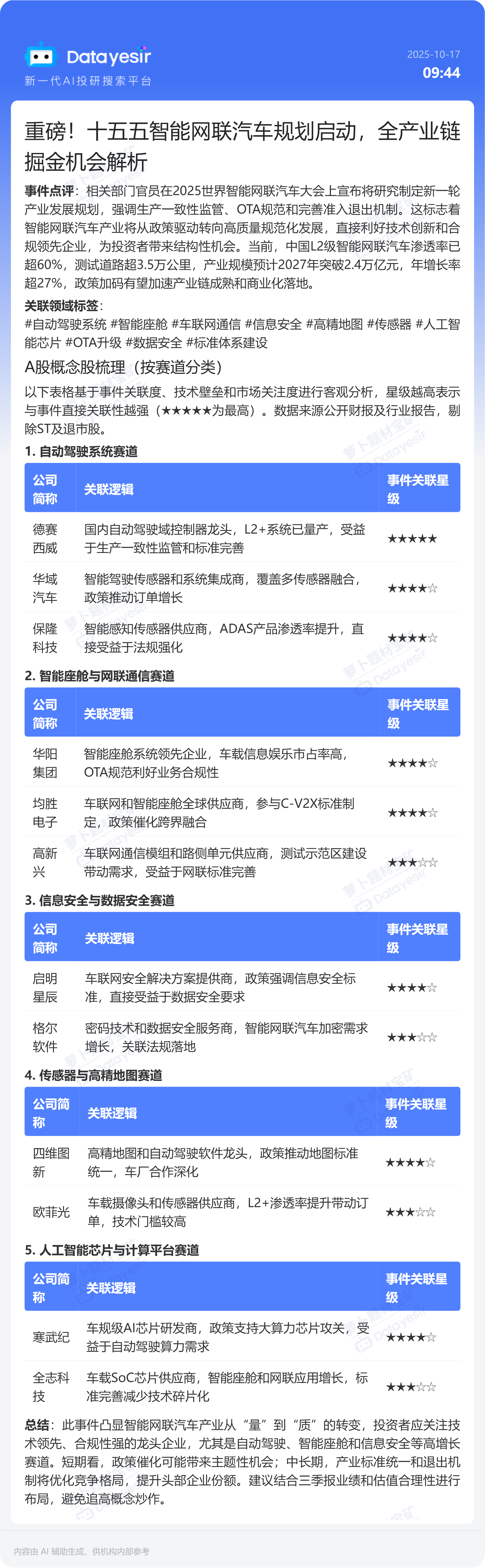 相关部门官员在2025世界智能网联汽车大会上宣布将研究制定新一轮产业发展规划,强调生产一致性监管、OTA规范和完善准入退出机制。这标志着智能网联汽车产业将从政策驱动转向高质量规范化发展,直接利好技术创新和合规领先企业,为投资者带来结构性机会。
