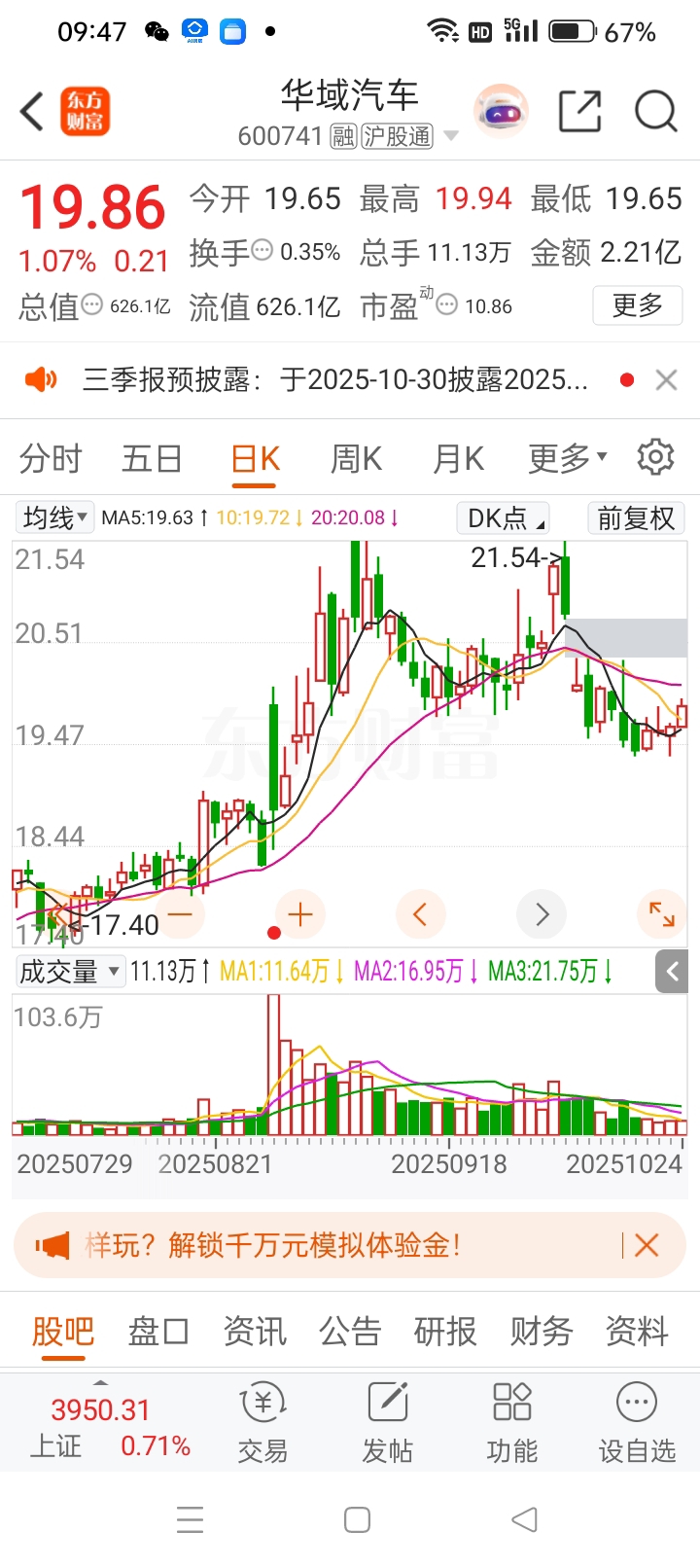 $华域汽车(SH600741)$ 周五这个交易日对于我来说是极其失败的,不可接受的,底仓有收益T仓却颗粒无收,很有挫折感,正T倒T无从下手,水平还有待提高,看来从韭菜成长为镰刀这条路还任重道远