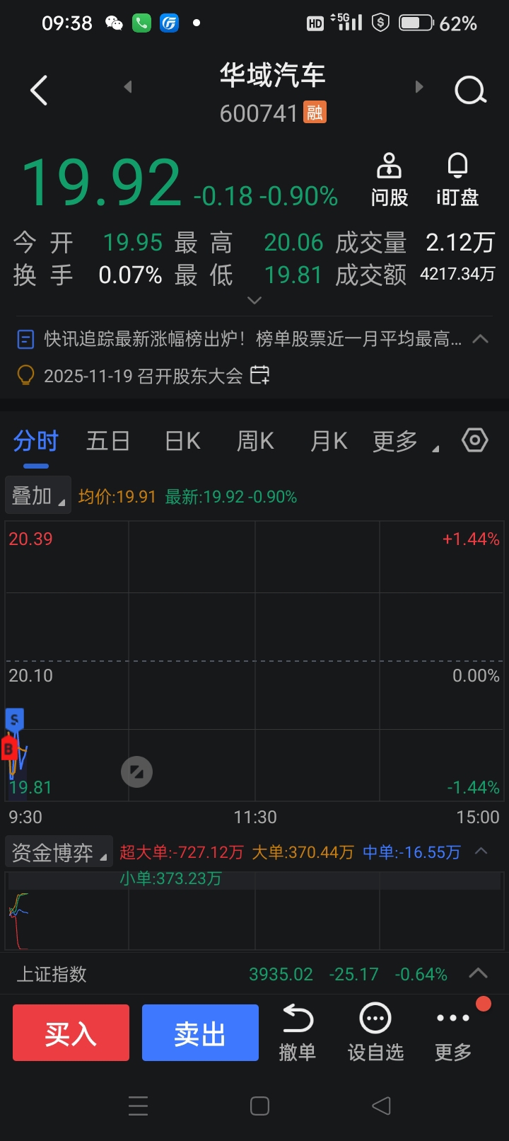 $华域汽车(SH600741)$ 快枪手耗时三分钟完成一次正T,19.84元买入,19.99元卖出,主力也不过如此而已
