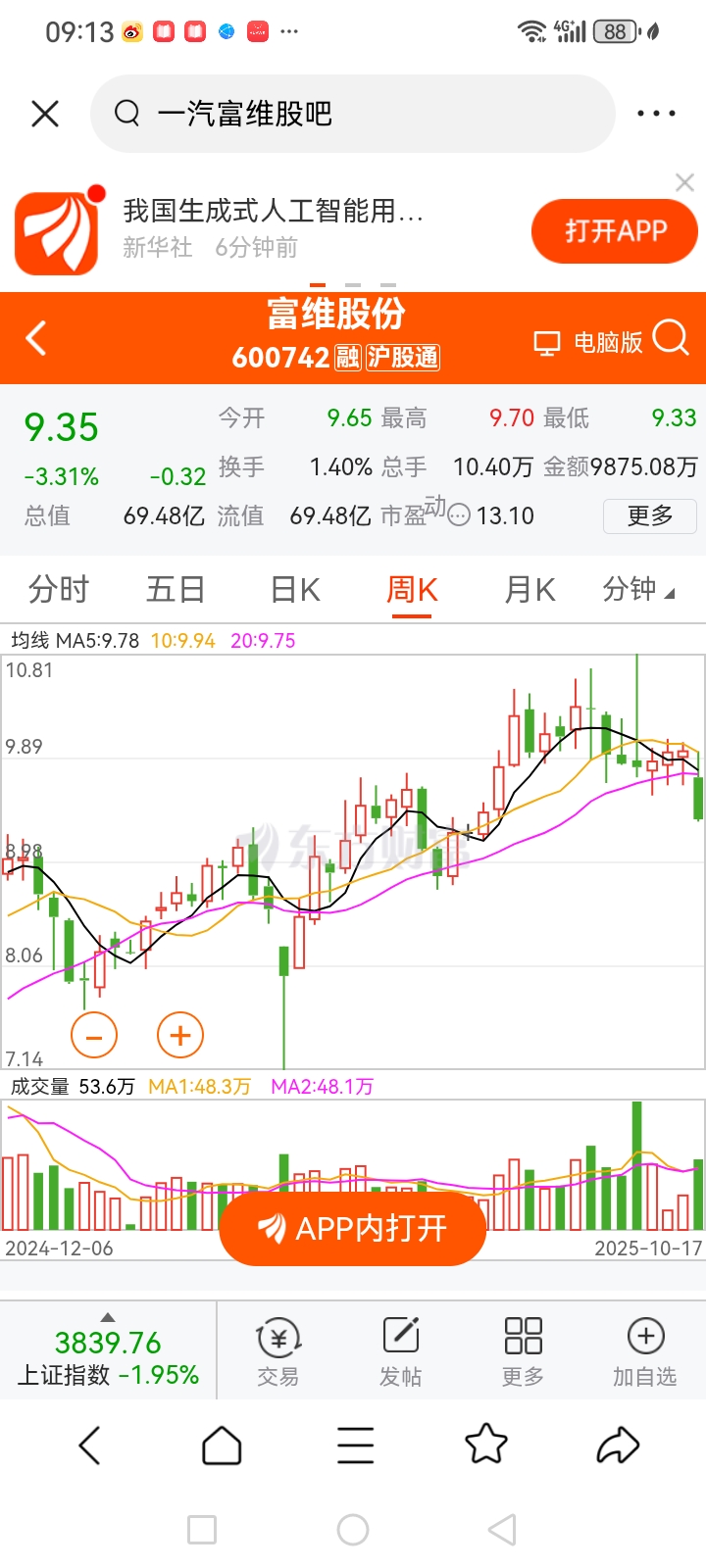 富维股份周K线图跌破20周线,并且5周移动平均线死亡交叉10,8.5元可以买入持