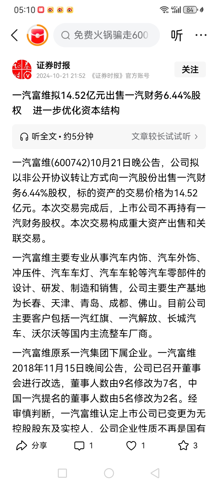 今天涨停板因为富维股份2024年10月21日转让一汽财务股权获得的14.5亿转让