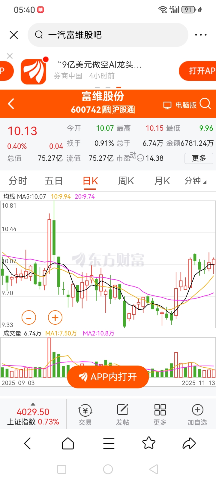 富维股份日K线图5日10日20日移动平均线多头排列股价站上5日移动平均线,股价要