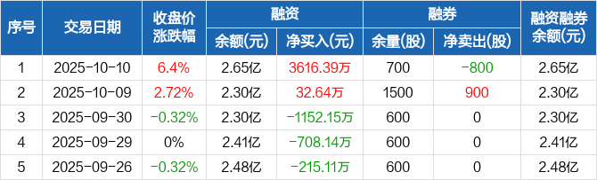 融资方面,当日融资买入8547.78万元,融资偿还4931.39万元,融资净买入3616.39万元。融券方面,融券卖出0股,融券偿还800股,融券余量700股,融券余额4774元。融资融券余额合计2.65亿元。