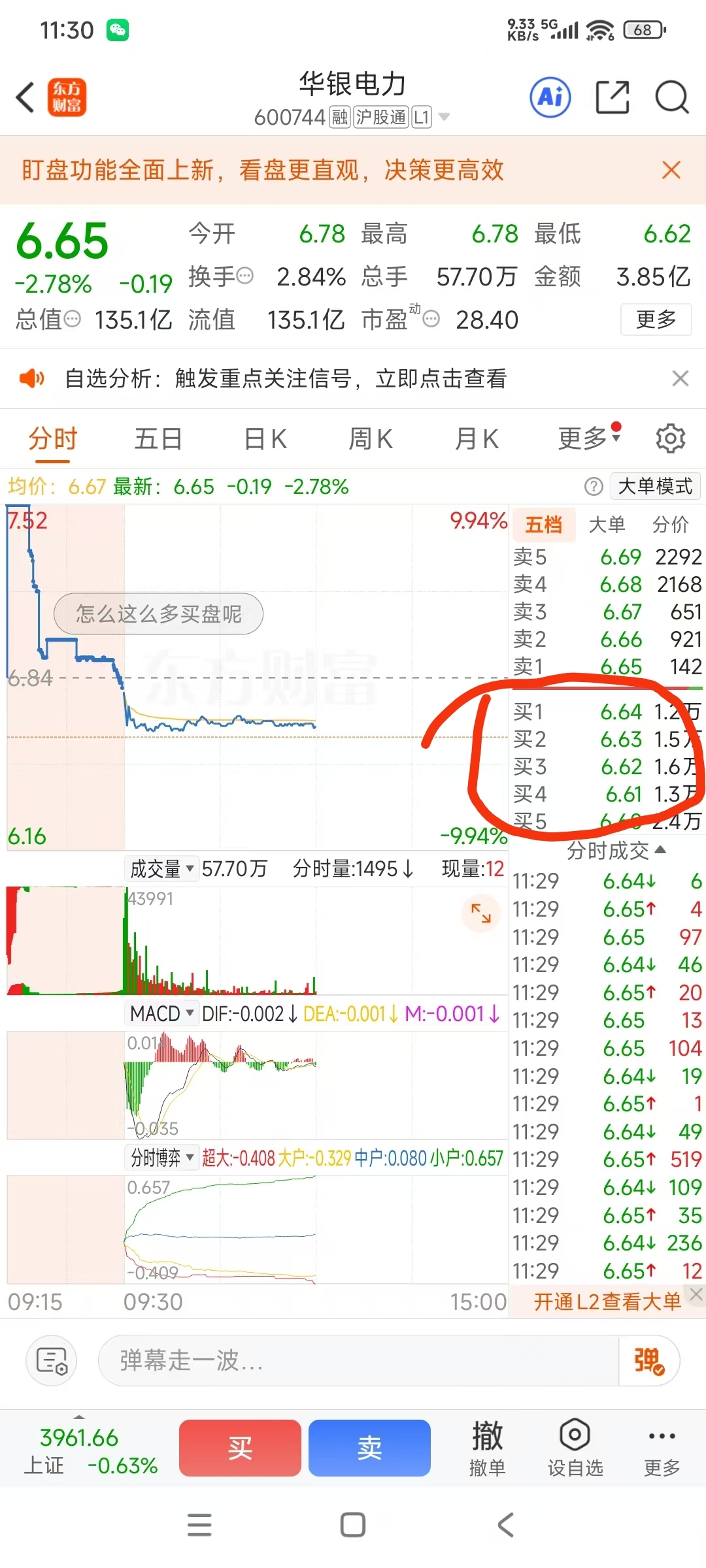 $华银电力(SH600744)$ 怎么这么多买盘呢,买的多了,不是应该涨价吗,怎么在这横着不动了么。